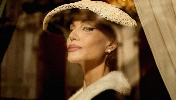 La productora italiana “The Apartment”, una de las responsables de “Maria”, compartió dos fotografías del filme: en una se ve a Jolie tras unas cortinas, con unas gafas grandes y un suéter blanco de lana.