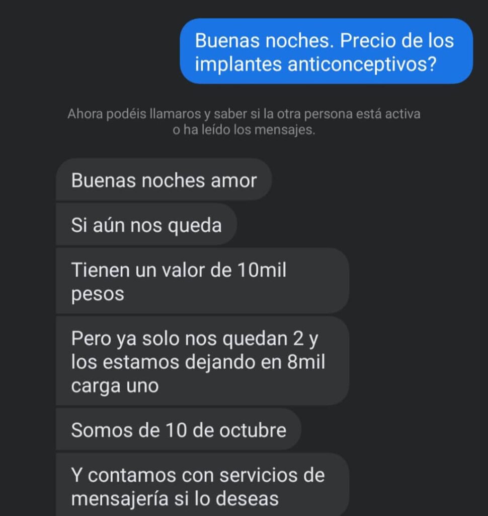 Por otro lado, las pastillas anticonceptivas importadas ─Microgynom fundamentalmente─ cuestan de 300 a 400 pesos el blíster (o sea, cobertura por un mes); un anticonceptivo intrauterino Multiload ronda los 1 200; y las vacunas trimestrales ─Depo-Provera, en su mayoría─ 600. Los implantes son más difíciles de conseguir.