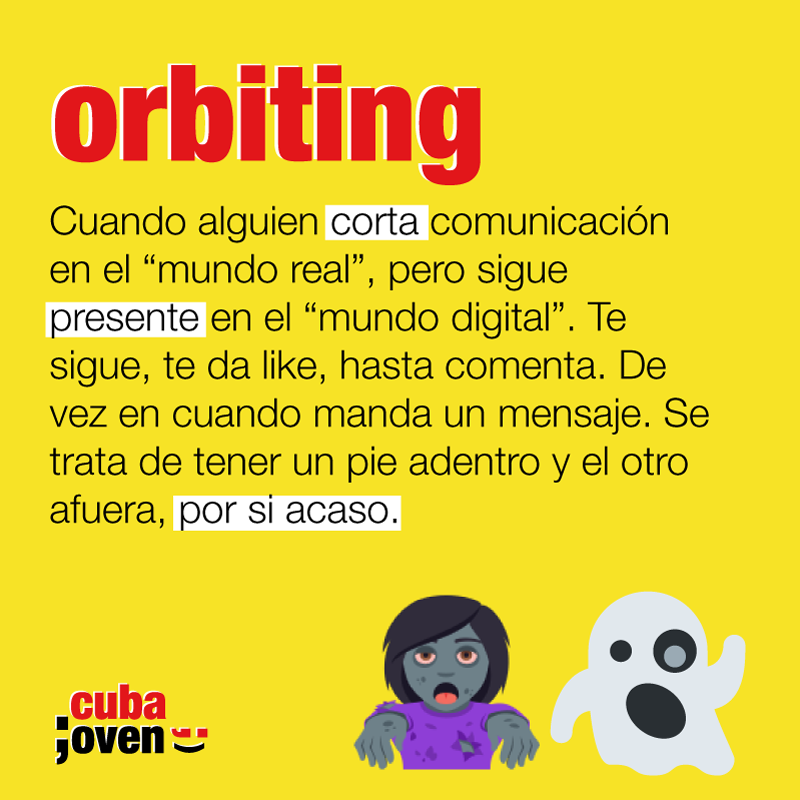 El término lo popularizó la escritora italiana Anno Iovine en 2018 refiriéndose a la conducta de una persona que corta comunicación con otra en el “mundo real”, pero sigue presente a través del “mundo digital” por medio de los me gusta, de comentar fotos, de dar retuits, seguir y dejar de seguir en diferentes plataformas. Precisamente, el verbo orbitar describe un movimiento circunvalatorio alrededor de algo o alguien pero que nunca se acerca.