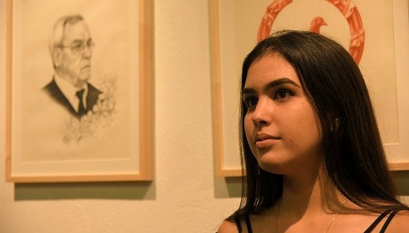 Stephanie Rivero en la exposición de dibujo ‘Homenaje Leal’, con motivo del natalicio 79 de Eusebio Leal. Foto: Néstor Martí