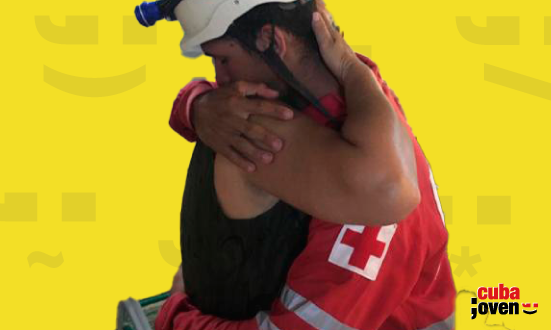 El espigado rescatista regresa, tiene el pantalón lleno de polvo de los escombros, las botas maltratadas por el trabajo unidas con un esparadrapo,.